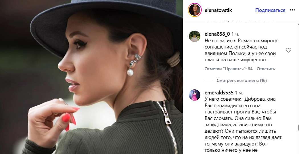 «Желаю вам сил и терпения»; «Верьте в себя!»; «Елена, вы сильная и мудрая. Держитесь»; «Здравомыслие на вашей стороне»; «22 года жизни и шесть детей заслуживают уважительного финала, а не войны на уничтожение»; «Ужас какой»; «Елена, будем молиться за вас и за детей!»; «Не согласится Роман на мирное соглашение, он сейчас под влиянием Польки»; «У него советчик – Диброва, она Вас ненавидит, и его она настраивает против Вас, чтобы Вас сломать», — высказались подписчики Товстик.