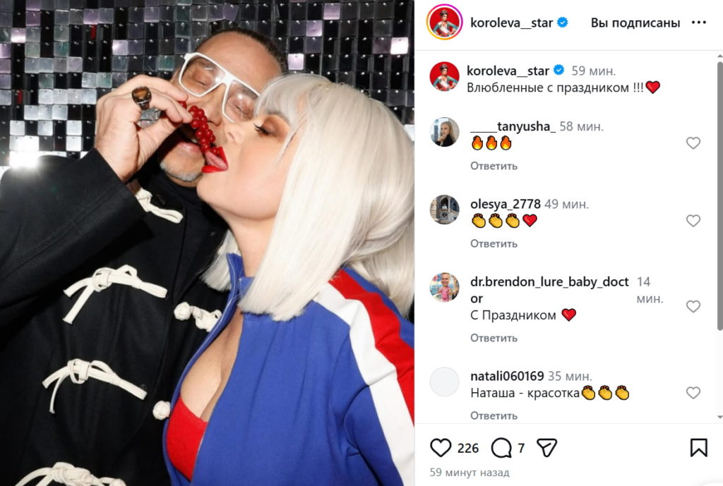 Еще 12 февраля исполнительница хита «Маленькая страна» зажигала на юбилее матери, где, к слову, так и не появились другие члены знаменитого семейства – Сергей и Архип Глушко. Но уже вчера Наташа Королева вместе с мужем заставила краснеть публику в родных пенатах – супруги демонстрировали непотребства у всех на глазах. Чего только стоит пикантный момент, когда Тарзан решил покормить возлюбленную красной смородиной. «Всем бы такую страсть после 20 лет брака», - позже констатировали факт поклонники звездной четы в соцсетях.