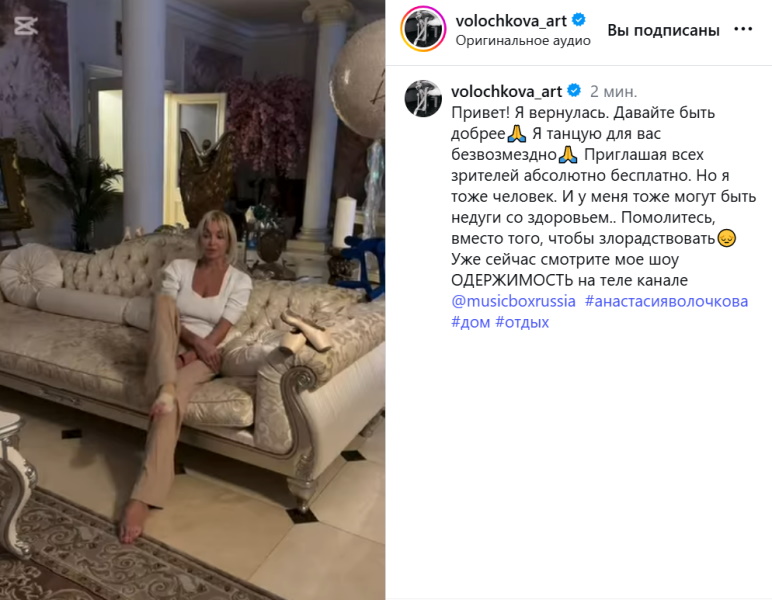 По словам Волочковой, домой она была вынуждена возвращаться на костылях – этого требовал протокол лечения. На обнародованных кадрах Анастасия Юрьевна снова порассуждала о завистливых хейтерах, причем делала она это сильно заплетающимся языком.