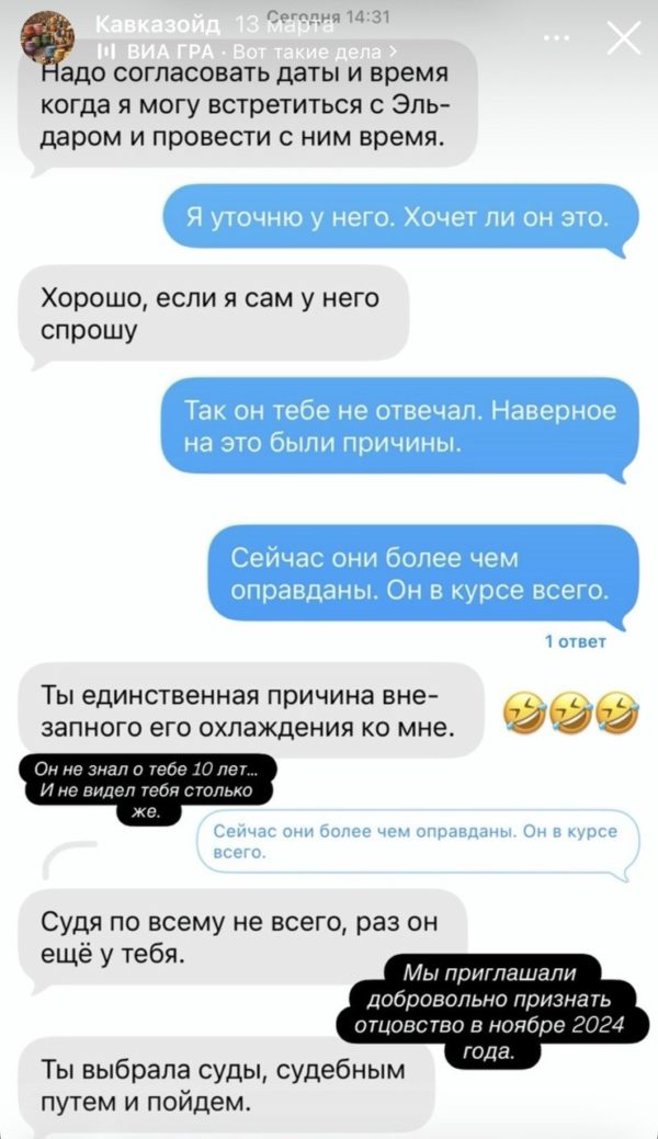 В итоге уже Кещяну пришлось выходить на связь. В беседе с журналистами Арарат предложил внимательно вчитаться во все то, что пишет мать его сына. Мол, ему тут даже нечего комментировать. «Почитайте ее сообщения, вы же все видели, зачем мне говорить. Опозорил на футболе? Да, это было смешно», — заявил актер. Но намерения у Кещяна более чем серьезные. В одном из сообщений Кретовой артист пригрозил, мол, будет забирать сына в свой дом:
