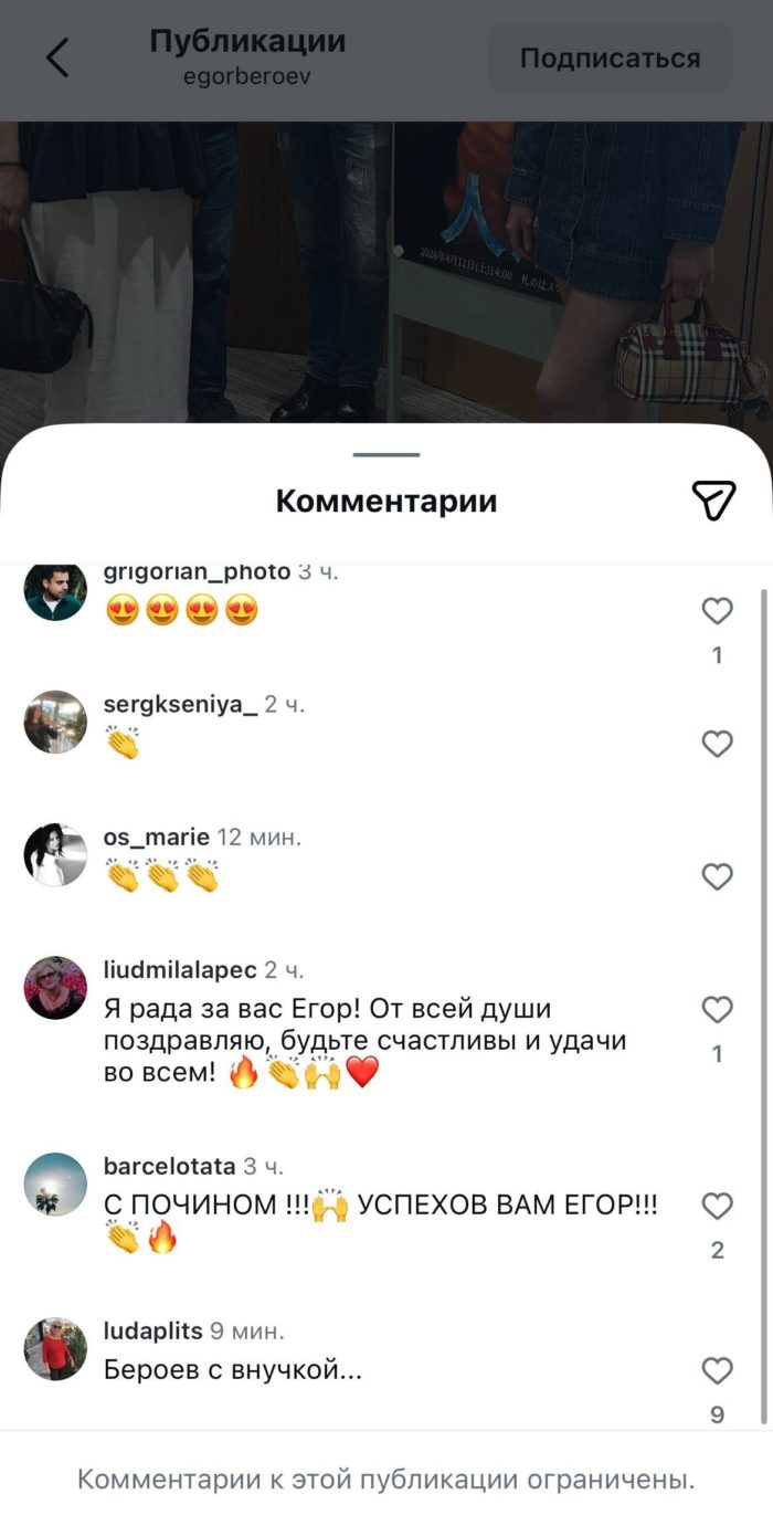 К сожалению, артист ограничил возможность комментирования своего поста. Далеко не все интернет-пользователи успели высказаться по поводу выхода Егора в свет с Анной. У них, напомним, разница в возрасте составляет 27 лет, и не все готовы спокойно воспринимать этот факт. Один из подписчиков все же успел оставить ироничный комментарий под новой публикацией актера, посмеявшись над ним: «Бероев с внучкой…»