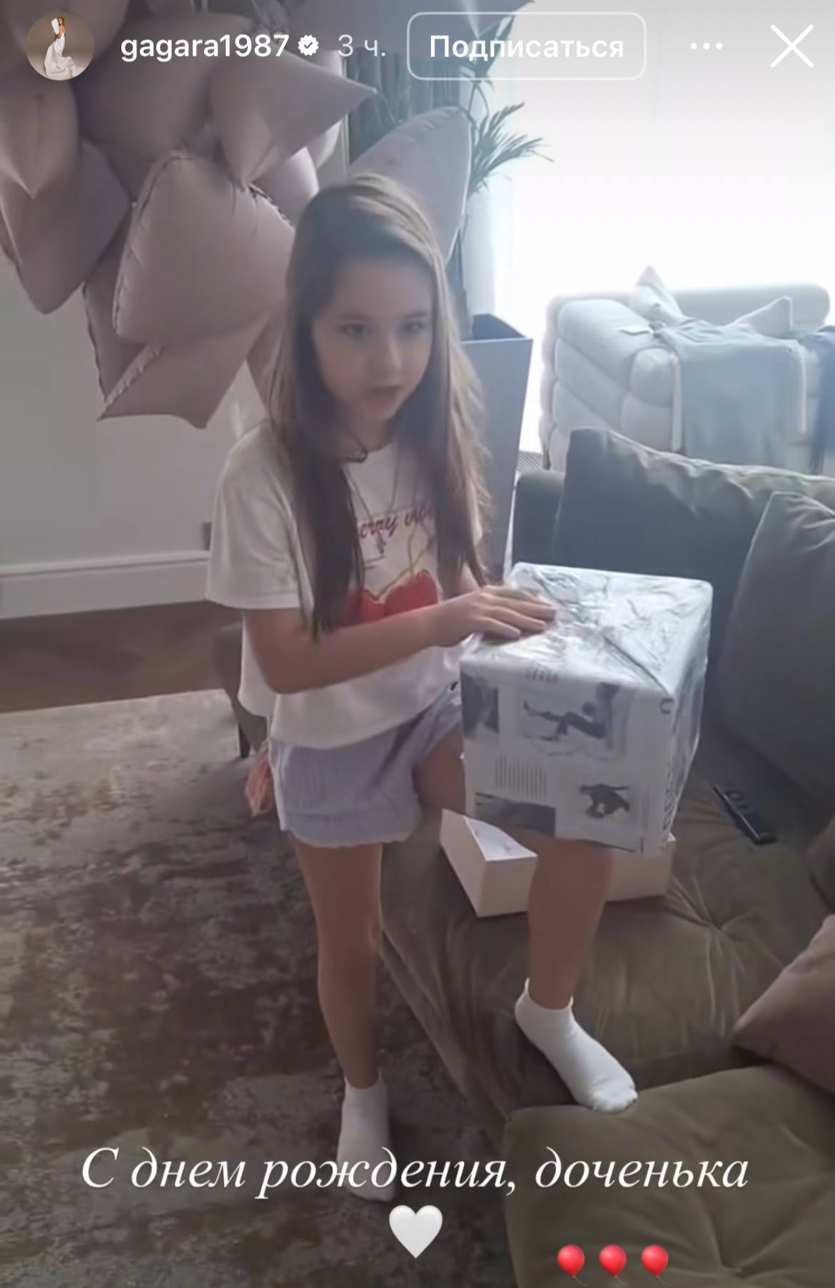 В этот день Мию ждало много сюрпризов. Когда она спустилась в гостиную, ее встретили не только охапки воздушных шаров, но и множество подарков: одежда, серьги и так далее. Реакцию девочки Гагарина снимала на камеру. Видно, что именинница осталась в восторге.