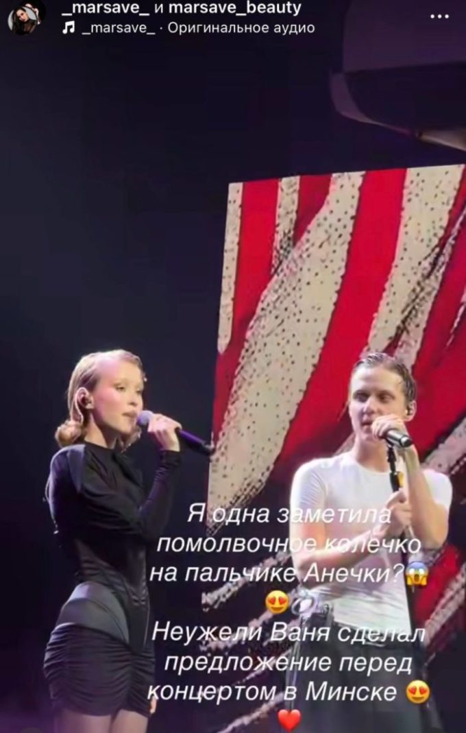 Разумеется, поклонников интересует, как будут развиваться отношения молодых людей дальше. Особенно после того, как на недавнем концерте в Минске Анна вышла на сцену к Ване, чтобы спеть дуэтом, и засветила кольцо, похожее на помолвочное. Фотографией поделилась одна из зрительниц: