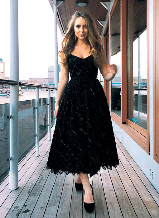 Стилист: Черный цвет всегда в тренде. Это платье из фатина смотрится на девочке изумительно. Такая длина сейчас на пике моды. Напрягает лишь выбор обуви - она слишком массивная. К платью с кружевными элементами шпильки - более правильный выбор.