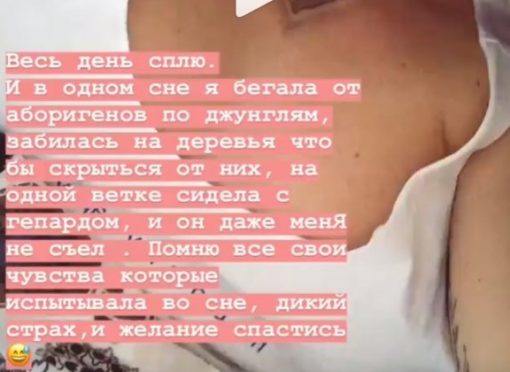 Девушка призналась, что очень много времени проводит в кровати и постоянно спит. В одном из снов она «бегала от аборигенов по джунглям». Спасаясь от преследования, Лобанова во сне забралась на дерево и оказалась на одной ветке с гепардом. «Он даже меня не съел. Помню все свои чувства, которые испытывала во сне – дикий страх и желание спастись», – поделилась своими эмоциями экс-участница «Дом-2».
