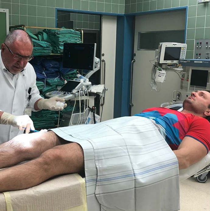 Прославленный циркач показал в Instagram* кадр, сделанный в одной из немецких клиник. На фото Эдгард лежит на кушетке, а врач в белом халате проводит с его коленом медицинскую процедуру.