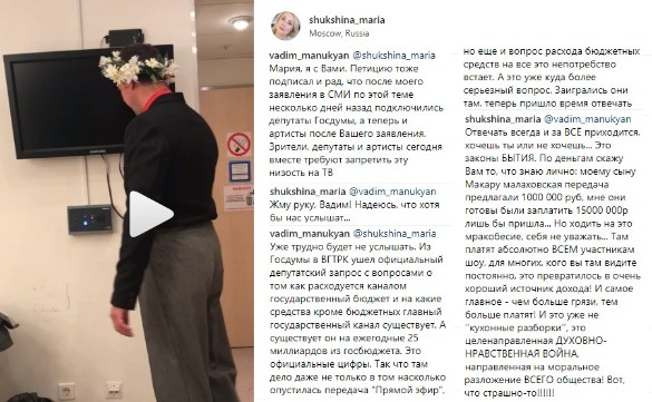 Как призналась артистка в разговоре с членом экспертного совета по развитию информационного общества и СМИ при Госдуме Вадимом Манукяном (беседа происходила в Instagram**-аккаунте Марии), представители «Прямого эфира» предлагали ей за появление в студии 15 миллионов рублей, а Макару — один миллион.