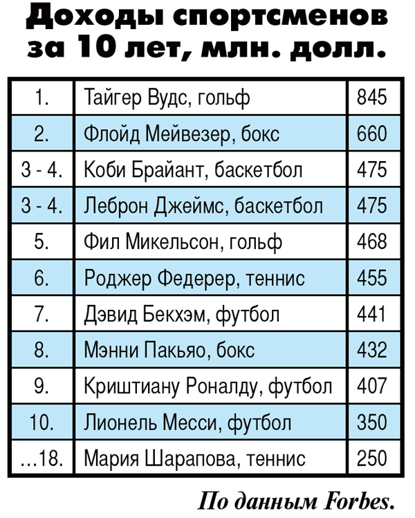 По данным Forbes, в течение нескольких последних лет перед дисквалификацией Шарапова зарабатывала каждый год до $30 миллионов, причем спорт приносил ей лишь десятую часть доходов. Главная денежка капала от рекламных контрактов с ведущими мировыми брэндами автомобильной, часовой, телефонной, спортивной, ювелирной и парфюмерной промышленности, а также от продажи конфет Sugarpova. За последние 10 лет ее доход составил $250 миллионов, при этом ракеткой за всю карьеру она заработала немногим более $38 миллионов.