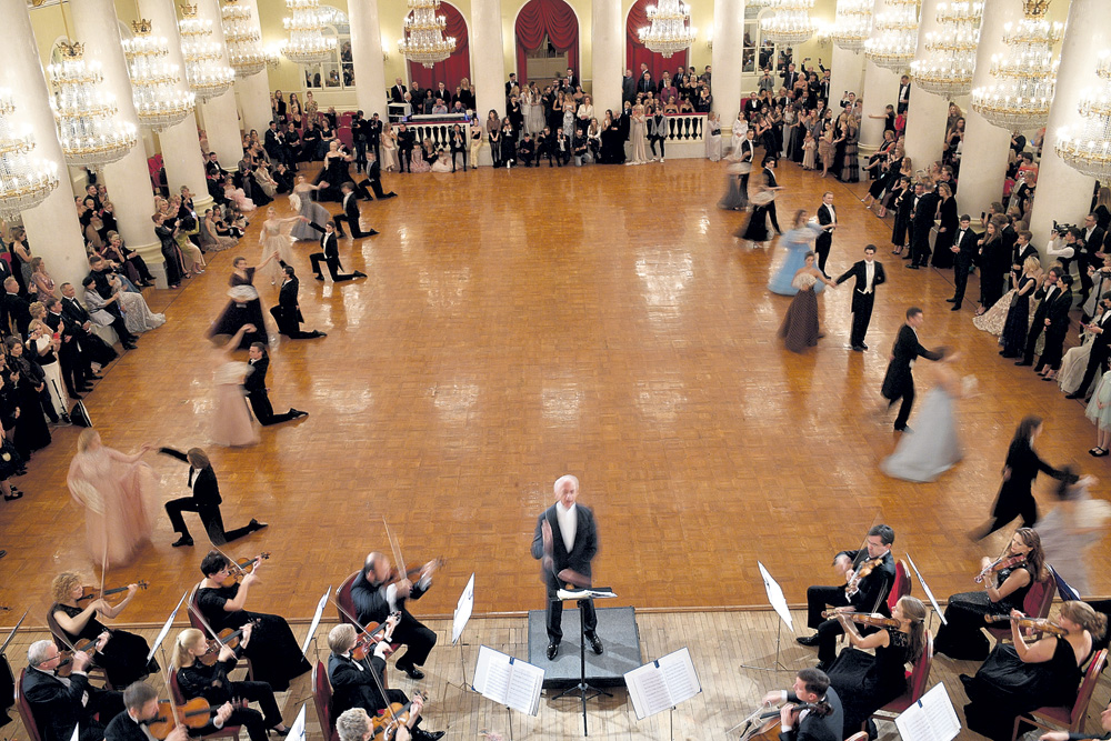 Когда грянул оркестр под руководством Владимира Спивакова, у меня чудь бокал из рук не выпрыгнул - так это было громко. Дебютантки выпорхнули в центр поля и зашаркали туда-сюда в ритме вальса. Получалось, прямо скажу, неплохо.
