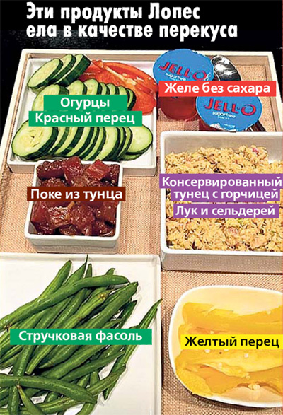На обед Лопес предпочитала котлеты из индейки, сваренное вкрутую яйцо, жареные шампиньоны с луком, брюссельскую капусту и другие свежие овощи, жареный рис с цветной капустой и авокадо. В день выпивала 3 л воды.
