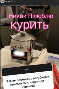 Но оказалось, что заботливая мама не смогла оставить вредной привычки ради ребёнка. На вопрос: «Как вы боретесь с пагубными привычками – например, курением?» Кудрявцева призналась: «Никак. Я люблю курить».