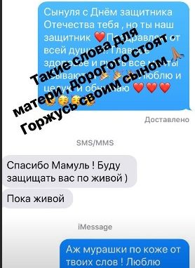 Только что Лера опубликовала в сторис фрагмент переписки с возмужавшим сыном Жаном. «Ты наш защитник! Люблю, целую и обнимаю!» - такими словам Кудрявцева поздравила сына с 23 февраля. «Спасибо, мама. Буду защищать вас, пока я живой», - написал в ответ Жан. Лера призналась, что от этого ответа у нее мурашки побежали по коже.