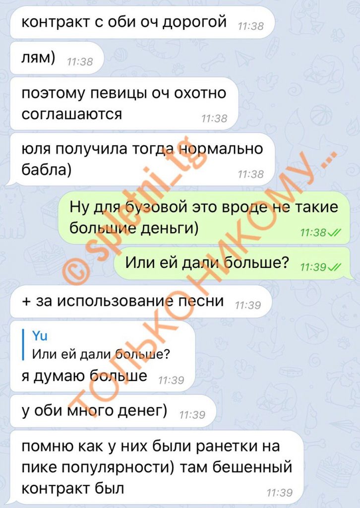 «Юлиана Караулова, зашкварившись на рекламе прокладок, не знала потом, как отмыться. А Бузовой хоть бы что. И как хорошо буквы совпали! Отдельная радость», — написал Telegram-канал «Только никому...». Один из подписчиков канала сообщил, что Карауловой за рекламу в Instagram* заплатили миллион рублей. Однако в случае с Ольгой Бузовой речь идет о гораздо большей сумме. По предположению авторов «Только никому...», контракт был заключен как минимум на три миллиона рублей. Сама Ольга Бузова пока никак не отреагировала на выдвинутые в ее адрес обвинения.