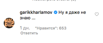Гарику, однако, подобные восторги не понравились. Харламов вспомнил о разыгранной им же сценке по поводу романа Ксении Собчак с Константином Богомоловым. В номере «Ксения Анатольевна» несколько раз говорила влюбленному режиссеру фразу «Ну, я даже не знаю» перед тем, как отдаться ему. Именно эту реплику Гарик Харламов и оставил в комментариях.