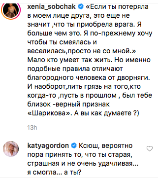 Подписчики, однако, негативно отреагировали на псевдофилософствования экс-ведущей «Дома-2» и только посмеялись над ее «глубокими» мыслями. В этом смысле Катя Гордон только выразила мнение многочисленных пользователей Интернета, не побоявшись открыто высказать то, о чем думают многие. Кстати, сама Собчак ответила на ее комментарий следующим образом: «Я рада за тебя!!! Но у всех разные проблемы».
