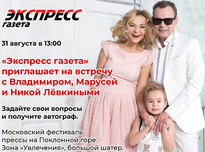 А в 13.00 в Большом шатре в зоне «Увлечения» «Экспресс газета» приглашает всех на встречу с Владимиром, Марусей и Никой Лёвкиными. Можно прийти, поучаствовать в живом интервью , задать любые вопросы, пообщаться, получить призы, послушать песни, взять автографы. Будет весело и интересно !