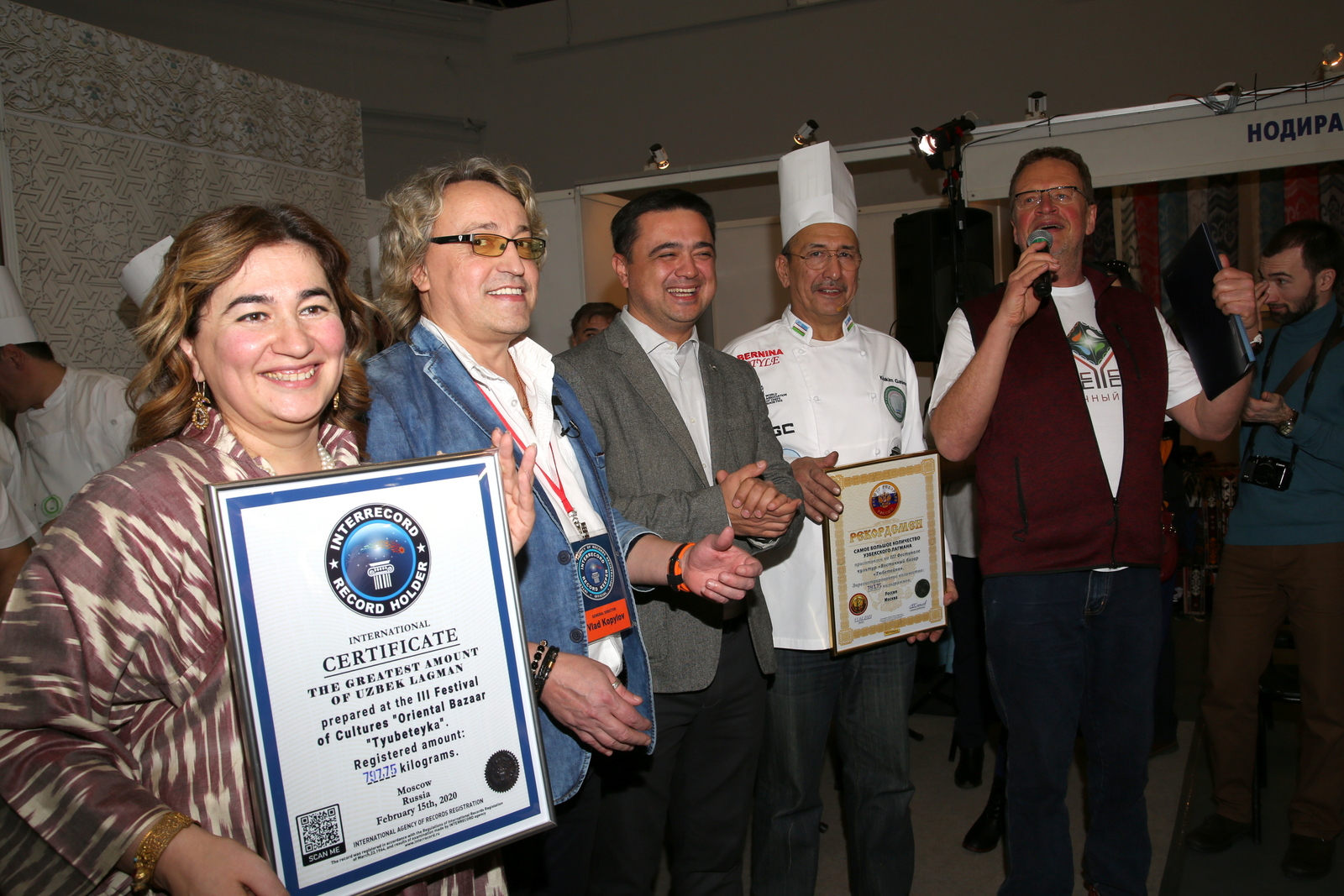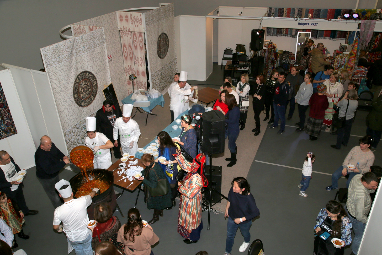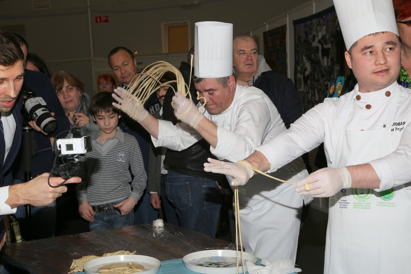 Ох и жаден наш народ до халявы! «Но чего только не сделаешь ради искусства», — говорит организатор процесса, главный ресторанный критик России Олег Назаров. Подумаешь, какие-то расходы! На все про все ушло всего-то пять центнеров отборного мяса. Длину лапши тоже посчитали. Оказалось что-то около пяти километров. Причем продукт отборный, привезенный специально для этого мероприятия из Узбекистана. Так же, как и специфические специи.