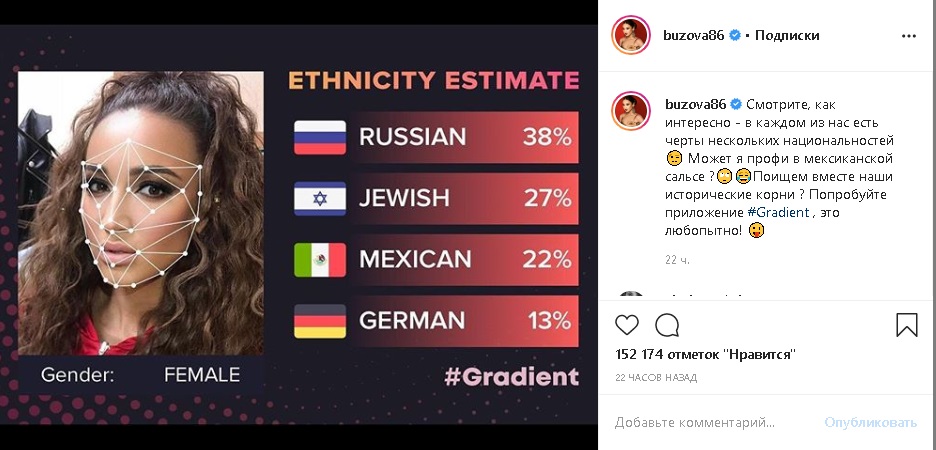 «Смотрите, как интересно — в каждом из нас есть черты нескольких национальностей. Может, я профи в мексиканской сальсе? Поищем вместе наши исторические корни?» — написала Бузова в .
