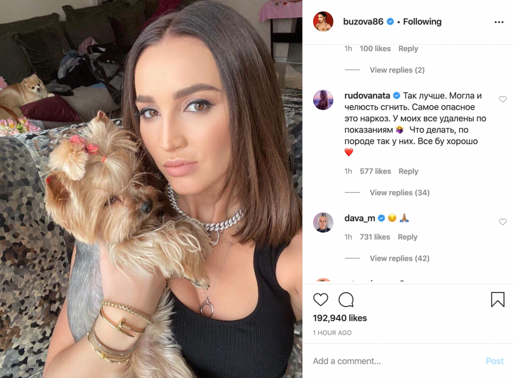 Фанаты дали Ольге сразу несколько ценных советов по поводу того, как стоит ухаживать за Евой после перенесенной операции. В комментариях отметились и многие знаменитости, которые подчеркнули, что Бузова приняла правильное решение. Как отметила фотомодель Наталия Рудова, в противном случае у собаки вообще могла сгнить челюсть.