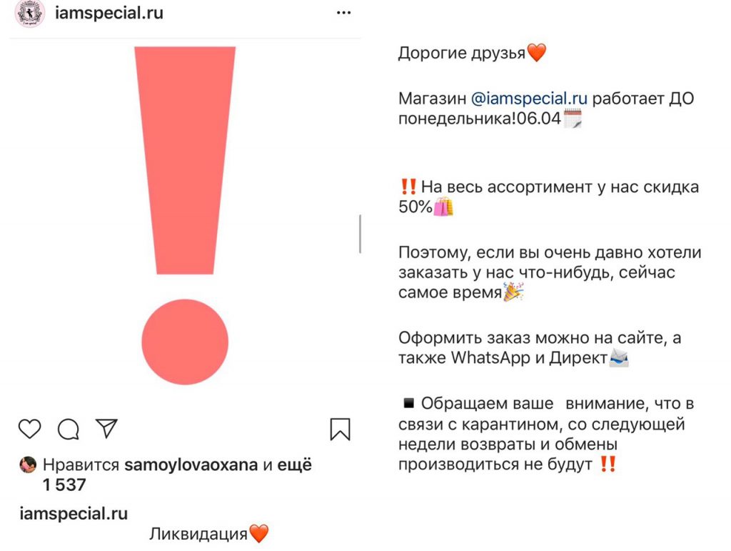 На странице магазина в «Инстаграме*» появилось объявление, что он работает до 6 апреля и в этой связи предоставляет скидку на весь ассортимент 50%. При этом уточняется, что в связи с карантином со следующей недели «возврат и обмен производиться не будут». То есть покупателям придется смириться с покупкой.