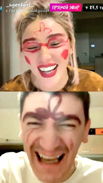 29-летняя Ивлеева же призналась, что у нее нет голубых трусов и что она пьет кофе с двумя ложками сахара. В поединке выиграла Настя. В качестве «наказания» юмористу пришлось срезать челку и нарисовать помадой на лбу пенис. Ивлеевой так понравился «макияж» 37-летнего друга, что она и себе намалевала мужской орган.