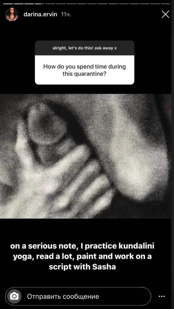 Художница, по ее словам, занимается йогой, много читает, рисует и «работает с Сашей над сценарием». В занятиях супруги Цекало нет ничего предосудительного, если бы не одно «но». Этот рассказ Дарина сопроводила порнографической картиной, на которой изображен мужской пенис, зажатый в руке.