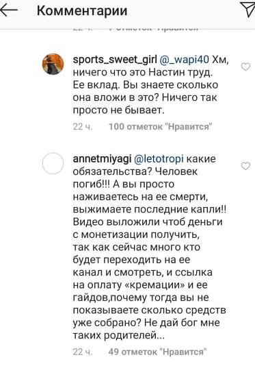 Подписчики считают, что родители Насти Тропицель наживаются на смерти дочери