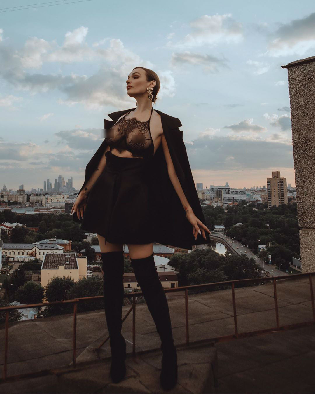 Модель и блогер Алена Водонаева поделилась с поклонниками новыми откровенными фото. Брюнетка сфотографировалась на крыше в черных чулках, наброшенном на плечи черном жакете и черном мини-платье. Маленькая деталь: на груди платье украшено абсолютно прозрачной кружевной вставкой, однако Водонаева обошлась без бюстгальтера.