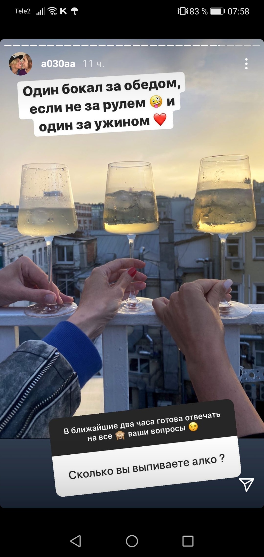 «Один бокал за обедом, если не за рулем, и один за ужином», —сообщила она.