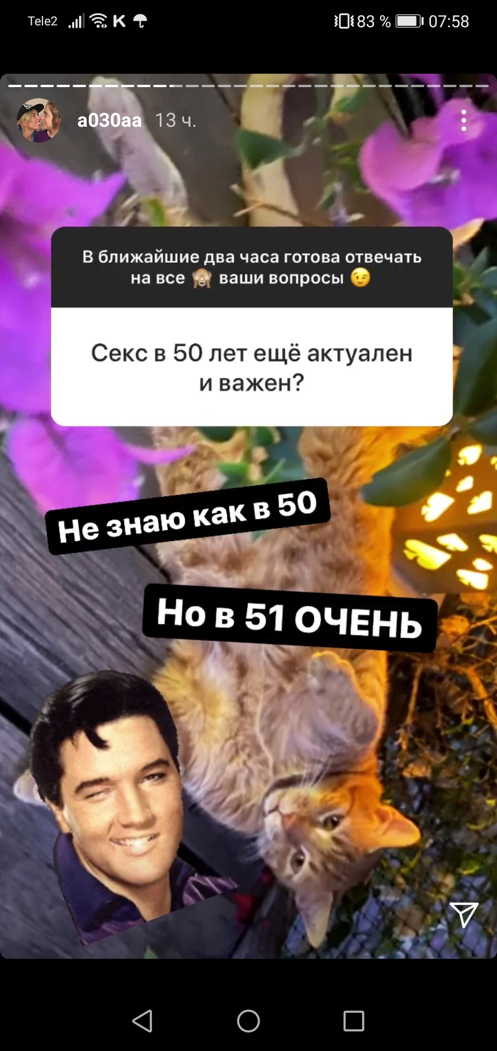 На вопрос: «Секс в 50 еще актуален и важен?» светская львица написала: