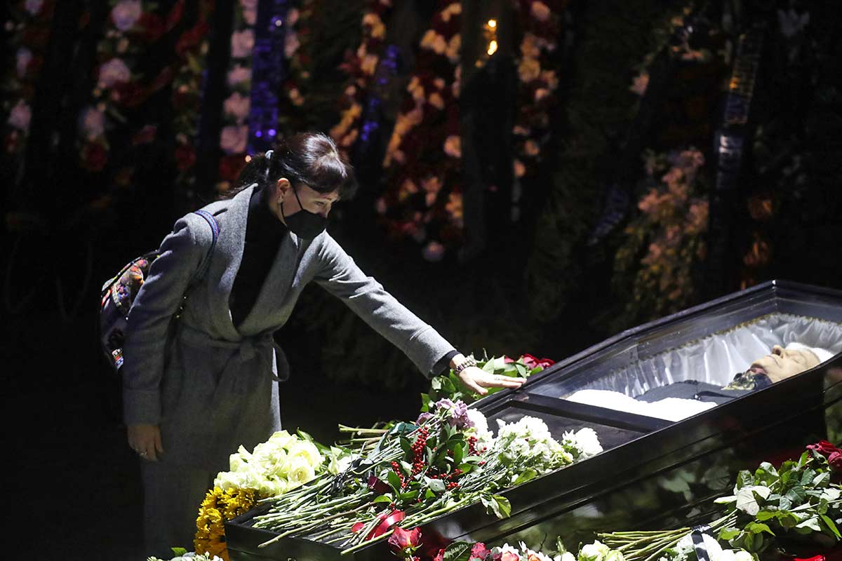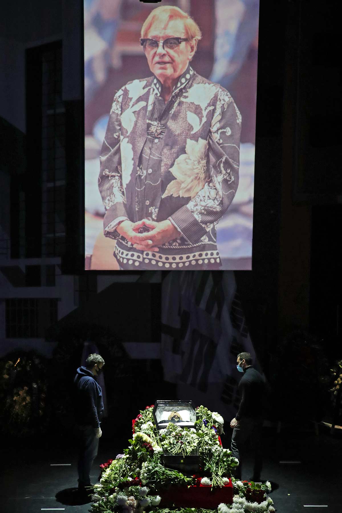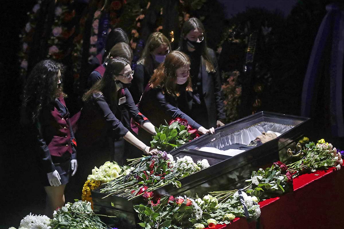 Гроб с телом Романа Виктюка поставили на основной сцене театра. Он почти утоплен в венках и цветах от скорбящих друзей, коллег, организаций. На большом экране, установленном над сценой, одна за одной сменяют друг друга фотографии режиссера. Церемонию прощания сопровождает тихая музыка, сообщает .