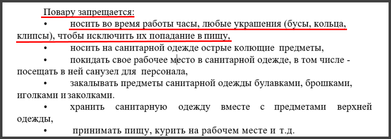 В этом же разделе указан запрет на ношение поварам и традиционных украшений в рабочее время, таких как часы и кольца. Также объясняется причина такого запрета – во избежание их попадания в пищу.