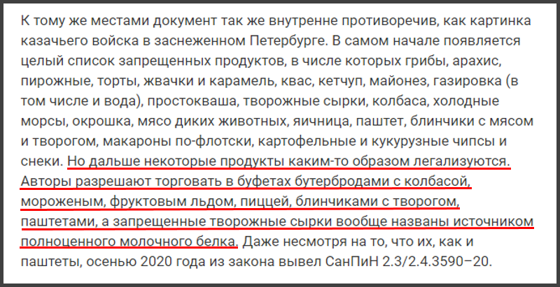 В отношении непосредственно самого питания у «Фонтанка» сделала также ряд замечаний, отметив, что якобы в одной части документа продукты разрешены, а в другой они же запрещены.