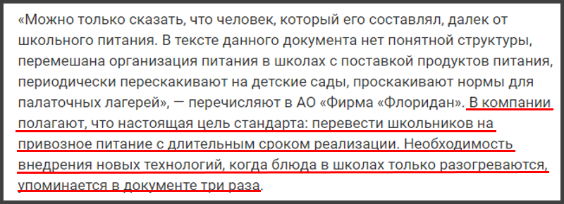 Утверждается, будто в комбинате питания конечной целью стандарта является перевод школьников на привозное питание, которое в самих столовых будет только размораживаться.