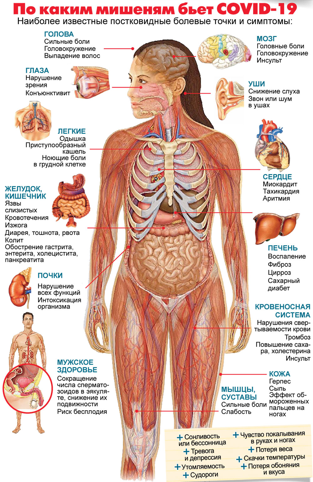 Наиболее известные постковидные болевые точки и симптомы:
