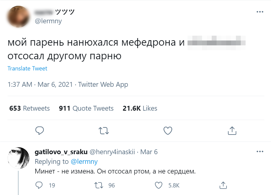 В ночь с 6 на 7 марта 19-летний юноша жестко расправился с 17-летней подругой в день ее рождения. Накануне преступления пара прославилась на весь русскоязычный Интернет. Девушка написала в «Твиттере», что ее парень под действием наркотика занялся оральным сексом с другим мужчиной. Указанный в записи наркотик известен тем, что обостряет сексуальное желание, которое становится почти невозможно контролировать. За это действие он прославился в среде наркотических оргий, которые называются «химсекс».