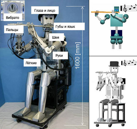 Японские «кулибины» не перестают удивлять мир все новыми диковинами в области роботехники. Робот-дворецкий, кибер-внучка, механическая любовница... Дошла очередь и до высокого искусства. Специалисты из университета Васеда много лет бились над созданием роботов-музыкантов. На сегодняшний день существует уже небольшой оркестр «железных дровосеков», которым под силу исполнить даже такое виртуозное произведение как «Полет шмеля» из оперы Римского-Корсакова «Сказка о царе Салтане». Правда, пока что целиком заполнить механическими музыкантами всю оркестровую яму японцам не под силу: 18 лет ушло на создание одного только робота-флейтиста. Уникальная машина обучена не только воспроизводить игру на флейте, она еще обладает уникальным вибрато, то есть, может произвольно менять высоту, силу, тембр звука и даже импровизировать. Легкие робота представляют собой упакованные в акриловые чехлы духовые меха. Пройдя через них, воздух поднимается к гортани и выходит через особым образом сконструированные язык, небо и губы. Пальцы робота шевелятся с частотой восемь герц, каждый из них движется независимо от других. Для большего «очеловечения» робомузыканта снабдили подвижными глазами и бровями, которые способны передавать его эмоции во время выступления. Уникальность конструкции в том, что она не только реально способна подменять заболевших флейтистов, но и преподавать новичкам азы профессии. Правда, еще ни одному человеку не удалось сравниться в скорости игры на флейте с железным учителем.