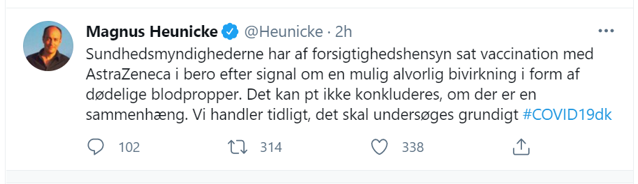 Министерство здравоохранения Дании обеспокоено опасными побочными действиями англо-шведской вакцины. Министр здравоохранения Магнус Хеунике выступил с заявлением в своем официальном Twitter-аккаунте: