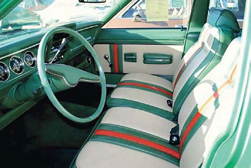 10. Автомобиль Hornet 1972 года компании American Motors с салоном, обшитым бежевой тканью в зеленую и красную полоску с логотипами Gucci.