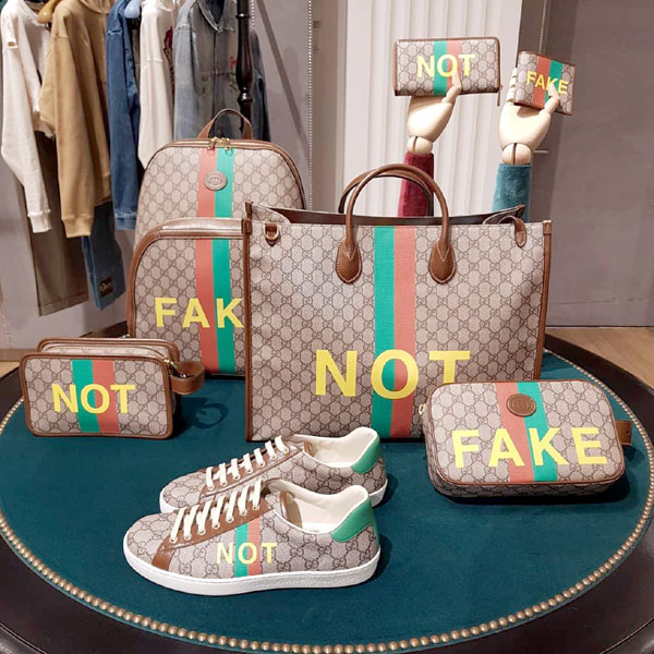 - Иронизируя над подделками, креативный директор Алессандро Микеле расписал платки неправильным названием бренда - GUCCY и выпустил коллекцию с надписью «Fake».