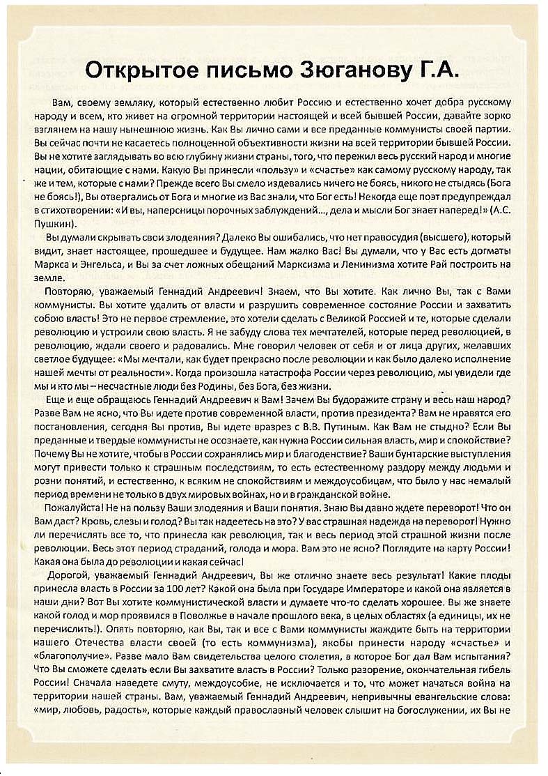 «Что вы сможете сделать, если захватите власть в России? Только разорение, окончательная гибель России! Сначала наведете смуту, междоусобие, не исключается и то, что может начаться война на территории нашей страны. Вам, уважаемый Геннадий Андреевич, непривычны евангельские слова «мир, любовь, радость», которые каждый православный человек слышит на богослужении, их вы не признаете. Вам нравится что-то другое. Cколько было убито, расстреляно, замучено и сколько было всячески пострадавшего русского народа от вашего красного террора и, как можно сказать, бледно выглядела сама наша Родина. Конечно, если еще мы будем жить, то наше поколение России будет стараться возродить страну (хоть в какой-то степени), какой она была до 1917 года.