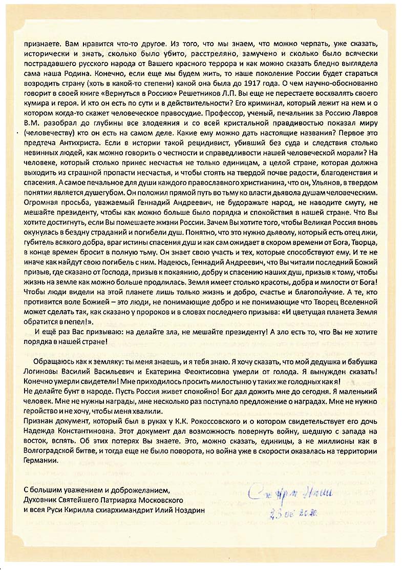 «Еще и еще обращаюсь, Геннадий Андреевич, к вам! Зачем вы будоражите и страну, и весь наш народ?.. Как вам не стыдно? Если вы, преданные и твердые коммунисты, не сознаете, как нужна России сильная власть, мир и спокойствие? Почему вы не хотите, чтобы в России сохранились мир и благоденствие? Ваши бунтарские выступления могут привести только к страшным последствиям, то есть естественному раздору между людьми и розни понятий, и, естественно, ко всяким неспокойствиям, междоусобицам, что было у нас немалый период времени и не только в двух мировых войнах, но и в Гражданской войне.