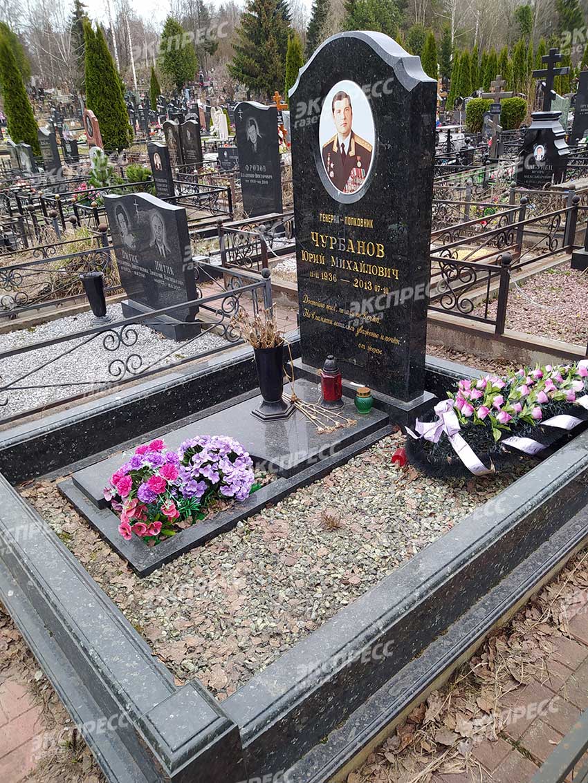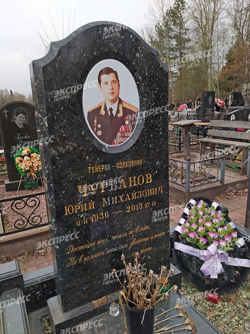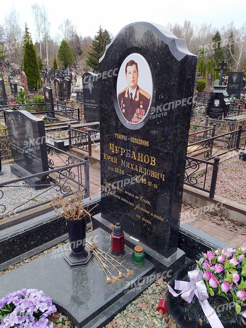 Его могила находится довольно далеко от главного входа, на участке кладбища, аккуратно огороженном по границам изгородью из туй. Строгий гранитный бордюр, плита и памятник с фотографией: Юрий Чурбанов в парадном мундире МВД с наградами, которые у него потом отобрали, как и звание генерал-полковника (его не реабилитировали даже посмертно, хотя запросы такие были). Искусственные букеты и венок, а также усохший букет гвоздик в гранитном вазоне. Некоторые буквы в надписи на памятнике стерлись, но пока еще хорошо читается эпитафия: «Достойно жил, печаль не в счет. Но в памяти остались уваженье и почет».