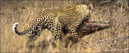 Американскому фотографу, удалось запечатлеть необычную картину - нападение леопарда на крокодила. Отчаянная схватка продолжалась около пяти минут, после чего окровавленный, но гордый победитель-леопард уволок добычу в ближайшие кусты.