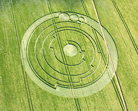 Этим летом на ячменном поле в графстве Уилтшир (Великобритания) были обнаружены необычные следы: круг с непонятными символами. Пока уфологи радостно потирали лапки, приветствуя очередное доказательство внеземного разума, творцы чуда «раскололись». Оказывается группа ученых-приколистов таким образом закодировала первые десять цифр числа Пи - 3,141592654.