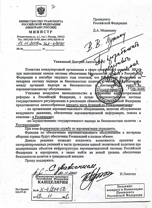 Министр транспорта Игорь ЛЕВИТИН обратился к Президенту России со странной просьбой. Он предлагает упразднить федеральную службу по аэронавигации, которая занимается государственным надзором за безопасностью полетов и предупреждением авиакатастроф. А ее функции передать в другие подразделения - Росавиацию и Ространснадзор. По мнению специалистов, такая реорганизация отрицательно скажется на безопасности полетов гражданских судов.