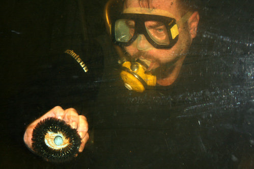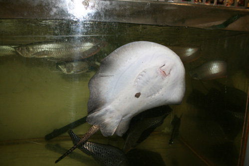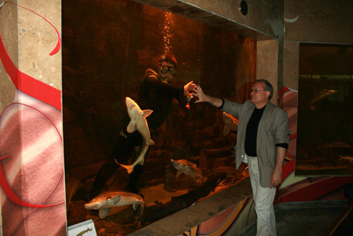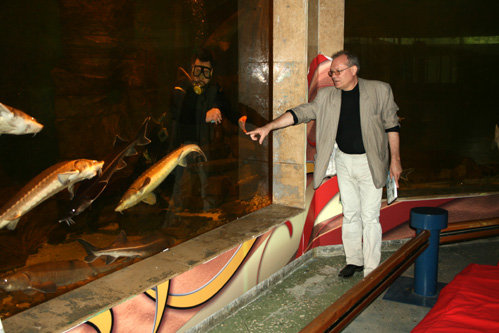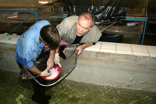 Теперь нам предстояла не менее сложная процедура - подоить самого крупного самца. Он плавал вместе с другими гигантами в просторном демонстрационном аквариуме. Игорь Помогаев облачился в костюм аквалангиста и опустился на трехметровую глубину. Его питомцы тут же приблизились, выпрашивая корм. Игорь изловчился, обеими руками схватил паку поперек туловища и уложил его в приготовленный нами сачок.