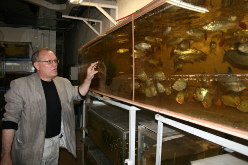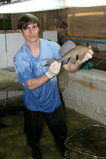 Руководитель аквариального комплекса Игорь ПОМОГАЕВ отловил чёрного паку для опытов по оплодотворению |