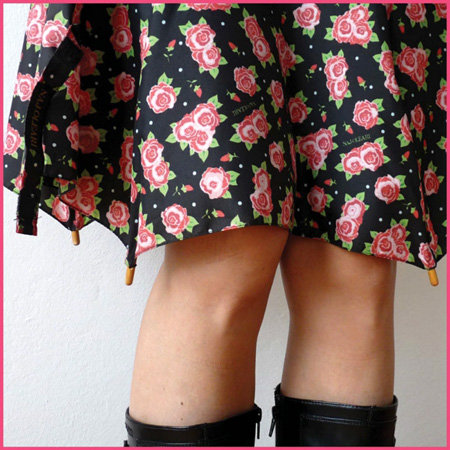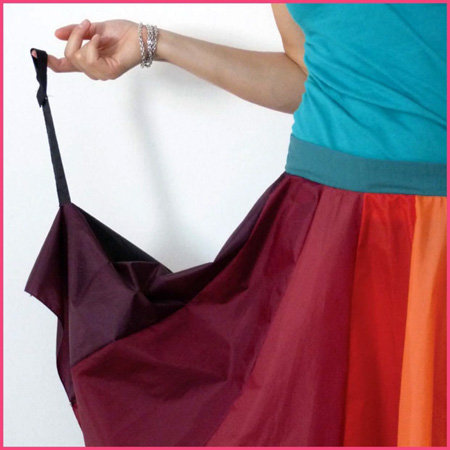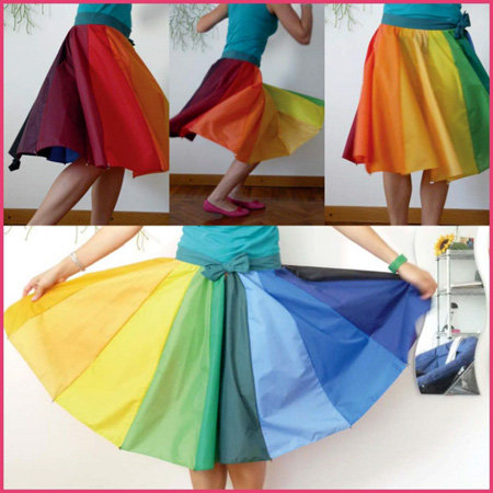 Девушка решила перекроить бабулины зонты в одежду. Для начала она вытащила спицы и уже из готовой ткани сшила юбку. Для оригинальности внизу вместо оборки она оставила пимпочки, призванные защитить прохожих от острых концов спиц, кстати, именно они и напоминают - перед нами бывший зонт. Подружки Сесилии пришли в полный восторг от столь необычной и оригинальной новинки - в дождливую погоду девчушки с удовольствием щеголяют по улицам в юбках-зонтиках, вызывая зависть у местных модниц.