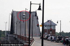Инцидент произошёл в городке Старжен Бэй (США, штат Висконсин). Женщина двигалась по мосту через реку и на середине пути остановилась - что-то в её машине заклинило. Пока автомобилистка пыталась разобраться, мост начали разводить. Видимо, дама быстро сообразила поставить авто на «ручник», потому что вниз она не скатилась, а так и стояла на месте. Через некоторое время мост свели, машина завелась и продолжила движение. Кто-то из очевидцев происшествия прислал в редакцию местной газеты фотографию. Но журналисты не поверили – решили, что шутник поигрался с «фотошопом» и теперь хочет обдурить их. Когда же, в течение недели, им поступили ещё несколько снимков от таких же свидетелей, репортёры позвонили в полицию и попросили стражей порядка подтвердить подлинность происшествия.